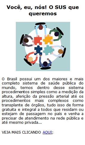 Essa página foi criada com o objetivo de destacar informações de relevância a promoção da saúde dos usuários/pacientes que utilizam os serviços da Estratégia Saúde da Família.